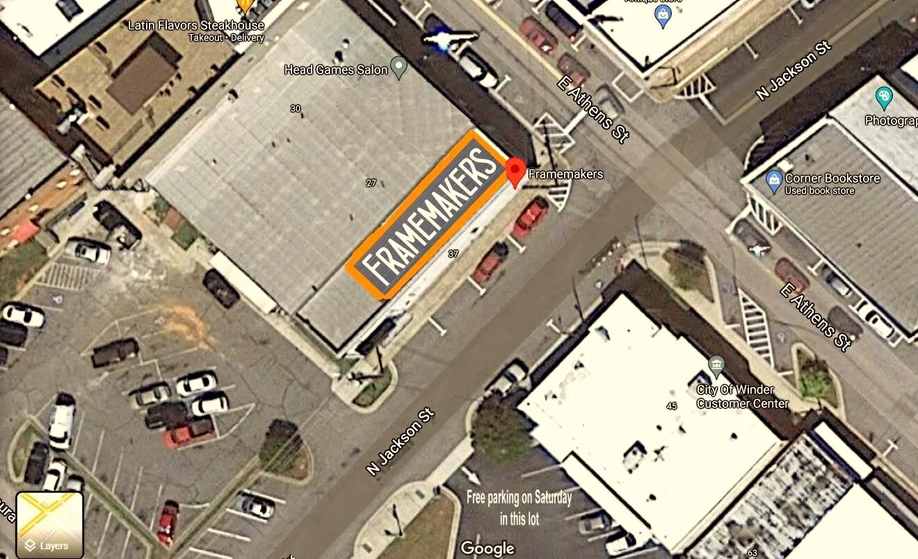 Parking is never a problem when visiting Framemakers. Pictured below is an aerial view of a typical day. We have plenty of free street parking and a large parking lot in the back of the building. On Saturdays the city of Winder’s lot across from us is open to the public. If you have large items and need assistance, please call or come inside and we will be more than happy to help you.